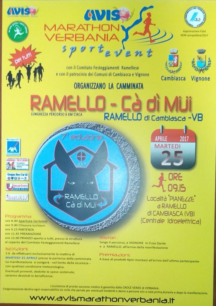 Il Comitato Festeggiamenti Ramellese, con il Patrocinio dei Comuni di Cambiasca e Vignone, organizza la Camminata non competitiva Ramello - Cà di Mui.