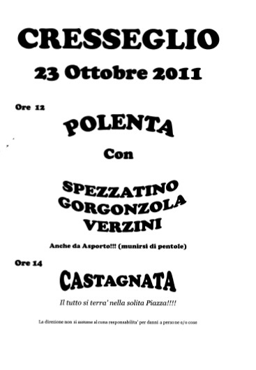 Il comitato festeggiamenti cresseglio, organizza per Domenica 23 ottobre presso la piazzetta di Cresseglio: - ore 12 polenta; ore 14 Castagnata. ... vedi locandina