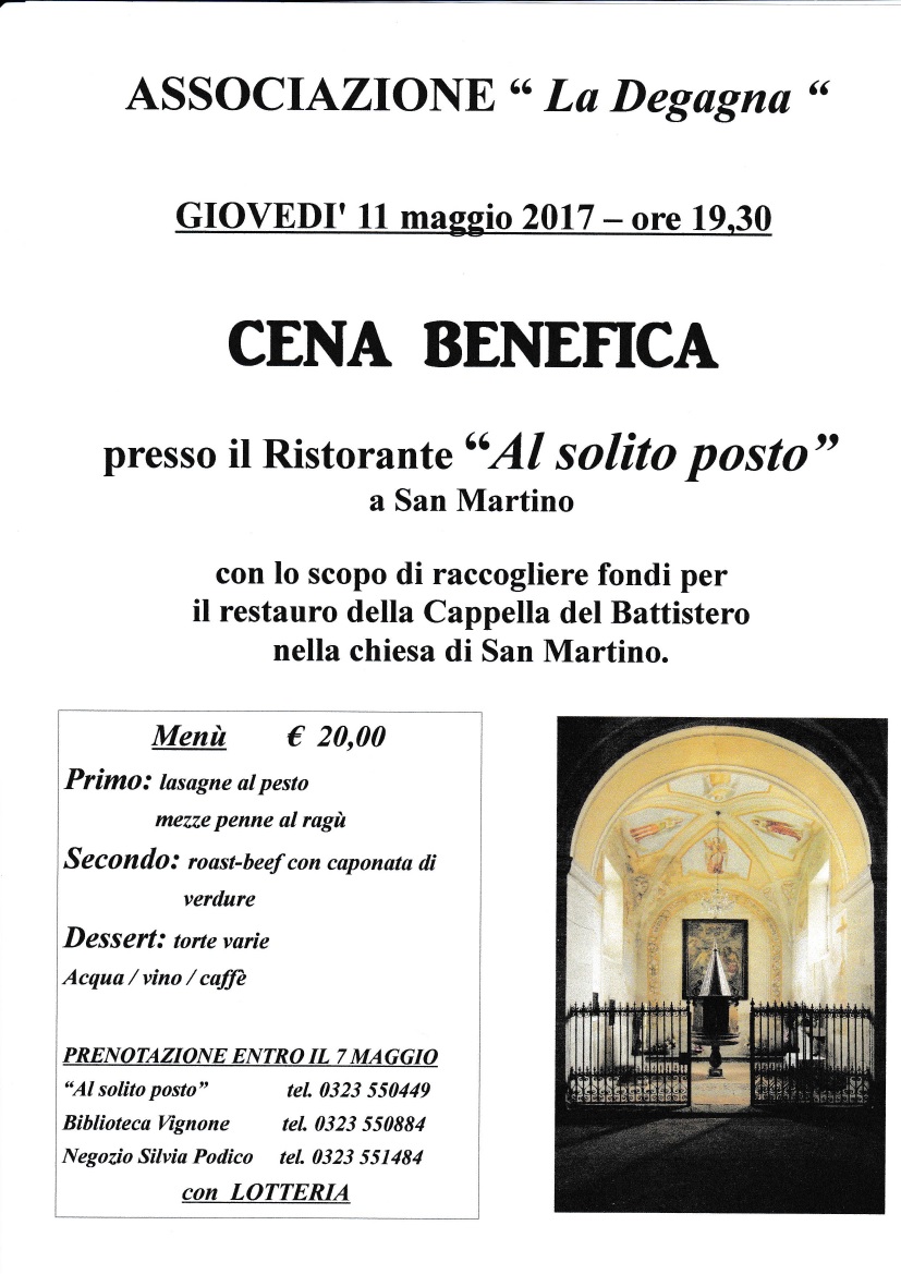 L'Associazione "La Degagna" organizza una cena benefica con lo scopo di raccogliere fondi per il restauro della Cappella del Battistero, nella Chiesa di San Martino.